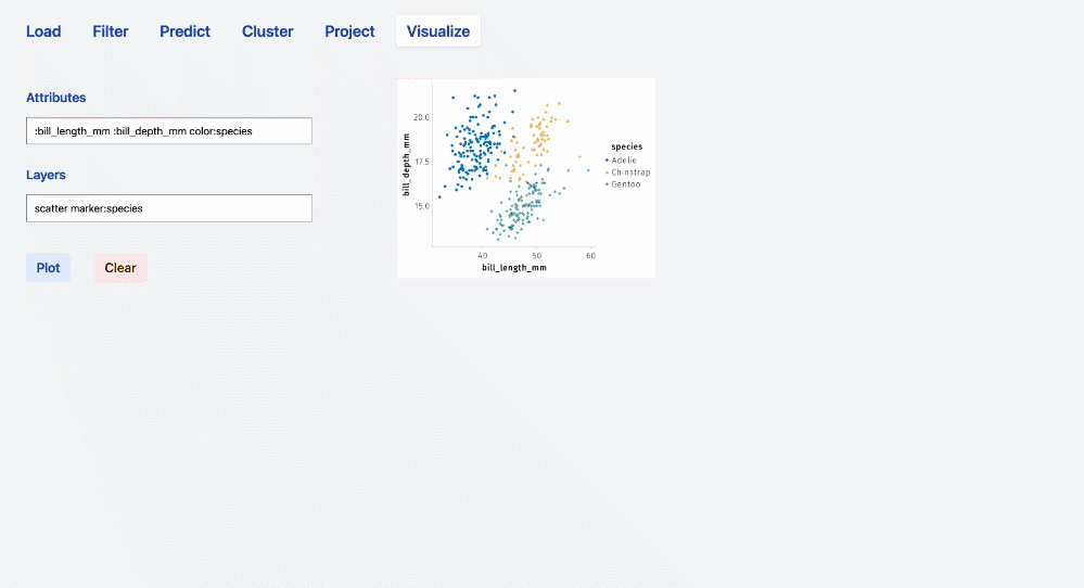 :column_1 :column2implies that the two selected columns will be used asxandyaxis of any plot that will be produced from such attributes. Adding more attributes such as:column_1 :column2 color:column_3means that thecolumn_3(being continuous or categorical) will be used to establish the color code associated with rendered plot. See examples in the following sections. - Layers. The layer field can be filled with one or more operations that will take the content of the Attributes filed as input (and specifications) and result in a series of superposed plots. For instance the syntax: