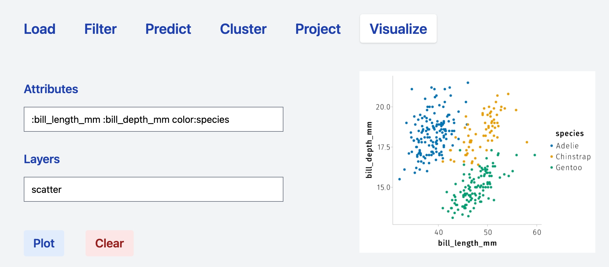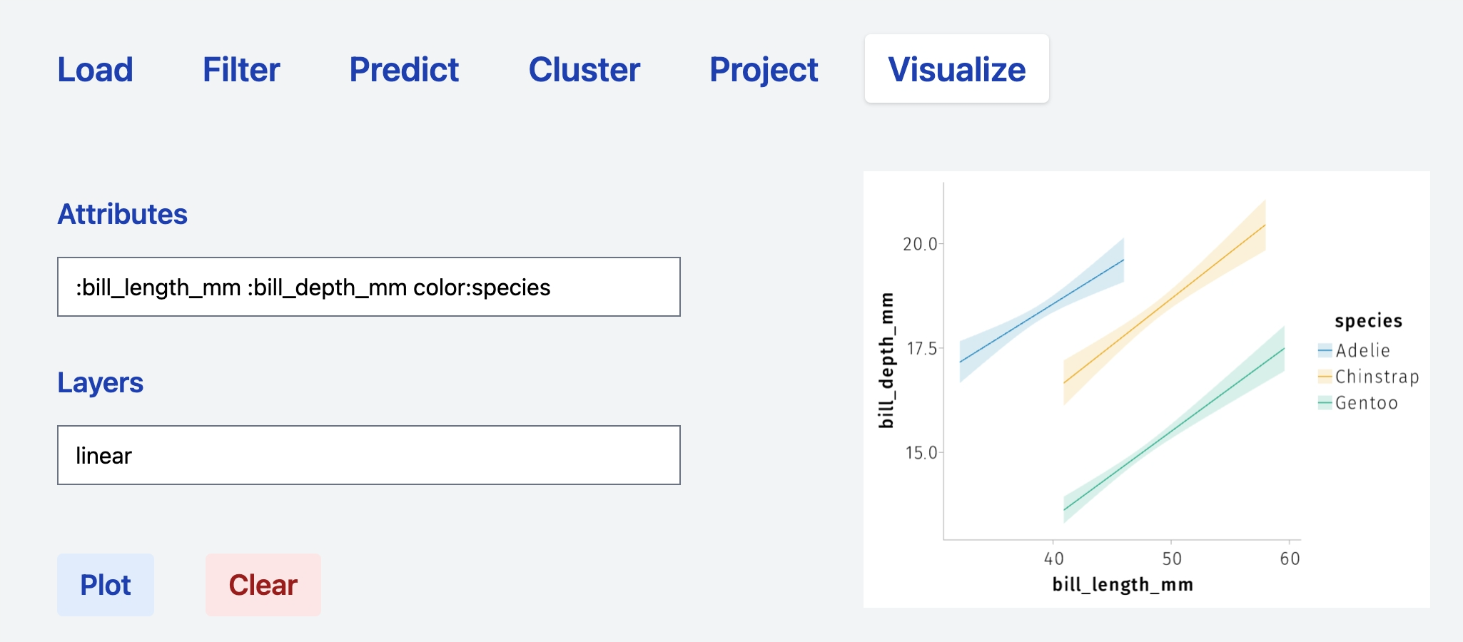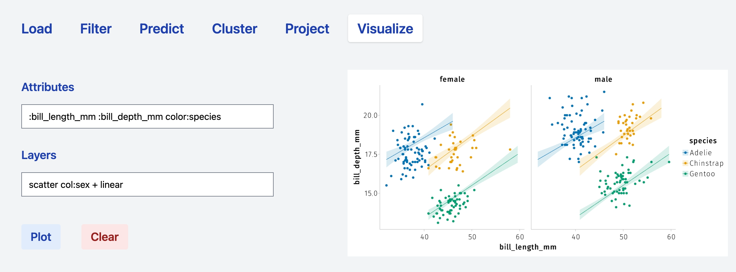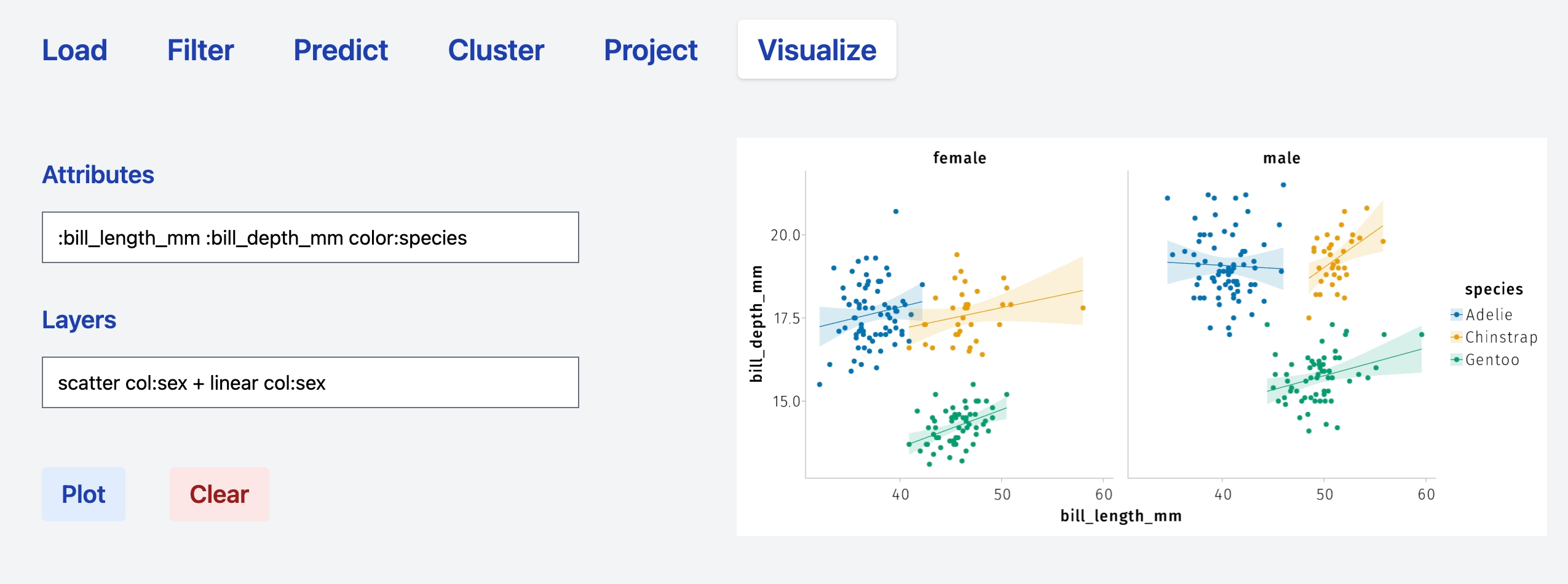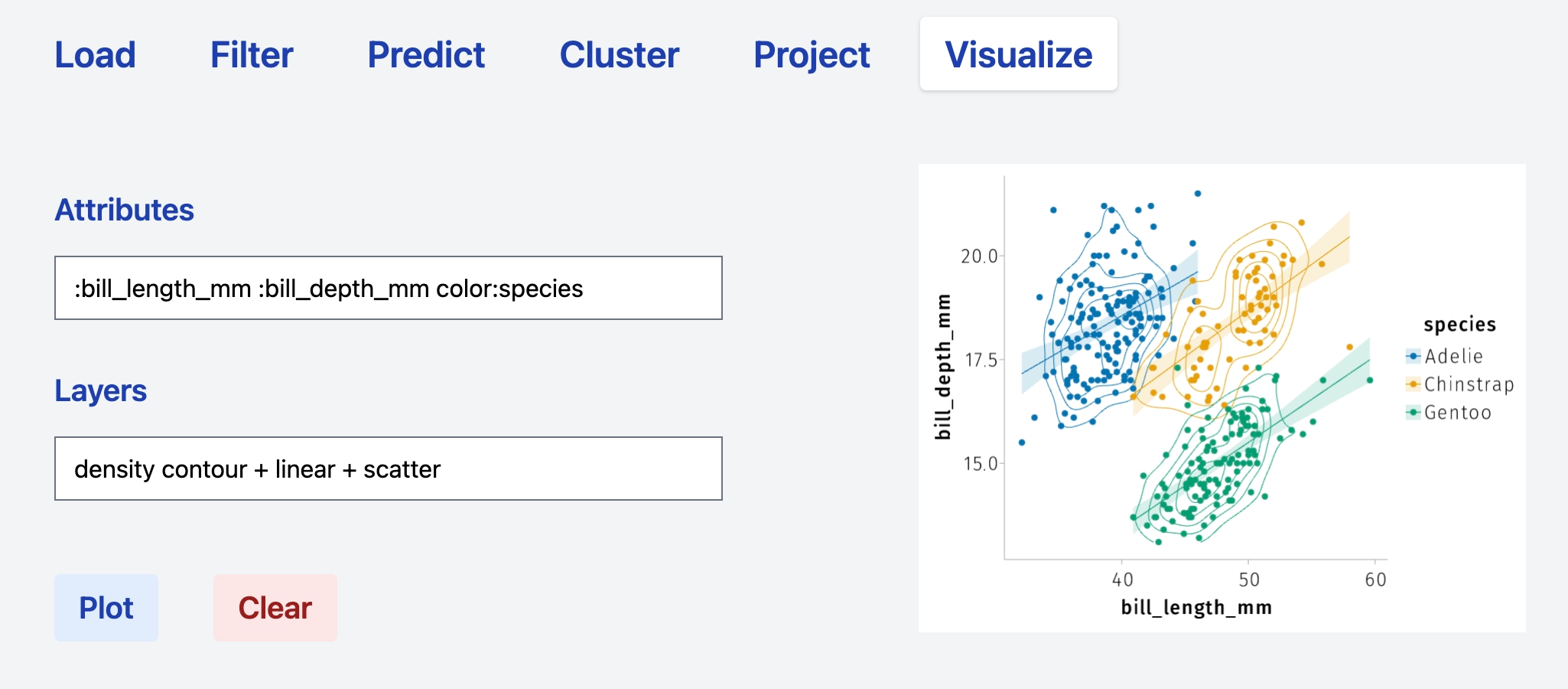 Attributes:column_1 :column2 color:column_3 Layers: scatterproduces a scatter plot havingcolumn_1andcolumn_2asxandyaxis, respectively, and whose points are colored according tocolumn_3. The+operator can be used to combine layers. Thus, the syntaxAttributes:column_1 :column2 color:column_3 Layers: scatter + linearrenders a scatter plot and a plots linear models according to the grouping defined bycolumn_3. Specifications relative to a specific operations can be added directly in theLayersfield. See the sections below for specific examples.